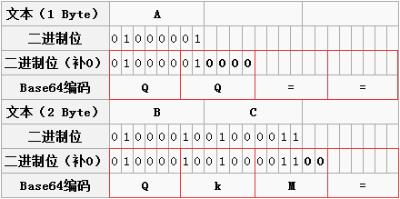但是转换到最后你发现不够三个字节了怎么办呢?愿望终于实现了,我们可以用两个Base64来表示一个字符或用三个Base64表示两个字符,像下图的A对应的第二个Base64的二进制位只有两个,把后边的四个补0就是了。所以A对应的Base64字符就是QQ。上边已经说过了,原则是Base64字符的最小单位是四个字符一组,那这才两个字符,后边补两个”=”吧。其实不用”=”也不耽误解码,之所以用”=”,可能是考虑到多段编码后的Base64字符串拼起来也不会引起混淆。由此可见Base64字符串只可能最后出现一个或两个”=”,中间是不可能出现”=”的。下图中字符”BC”的编码过程也是一样的。