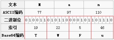 那么怎么用6个有效bit来表示传统字符的8个bit呢?8和6的最小公倍数是24,也就是说3个传统字节可以由4个Base64字符来表示,保证有效位数是一样的,这样就多了1/3的字节数来弥补Base64只有6个有效bit的不足。你也可以说用两个Base64字符也能表示一个传统字符,但是采用最小公倍数的方案其实是最减少浪费的。结合下边的图比较容易理解。Man是三个字符,一共24个有效bit,只好用4个Base64字符来凑齐24个有效位。红框表示的是对应的Base64,6个有效位转化成相应的索引值再对应Base64字符表,查出”Man”对应的Base64字符是”TWFU”。说到这里有个原则不知道你发现了没有,要转换成Base64的最小单位就是三个字节,对一个字符串来说每次都是三个字节三个字节的转换,对应的是Base64的四个字节。这个搞清楚了其实就差不多了。