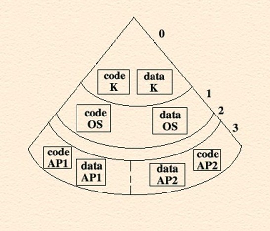 在每一任务之内定义了4种保护级别 , 通过Ring级别进行了访问控制,以环的方式表示见下图:
