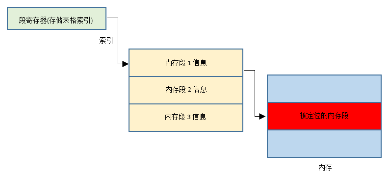 保护模式和实模式一样,都是通过段寄存器和通用寄存器来进行寻址,区别是实模式只有20位地址线的寻址能力,而保护模式有32位地址线的寻址能力,保护模式和实模式一样,也是把内存分成了一个个内存段来表示,把已经分好的内存段信息存入一张表格中,段寄存器中保存要访问的表格的索引,寻找内存段的流程如下图所示: