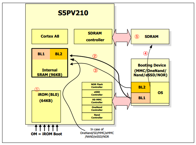210内置了一块96KB大小的SRAM(叫iRAM),同时还有一块内置的64KB大小的NorFlash(叫iROM)。210的启动过程大致是: