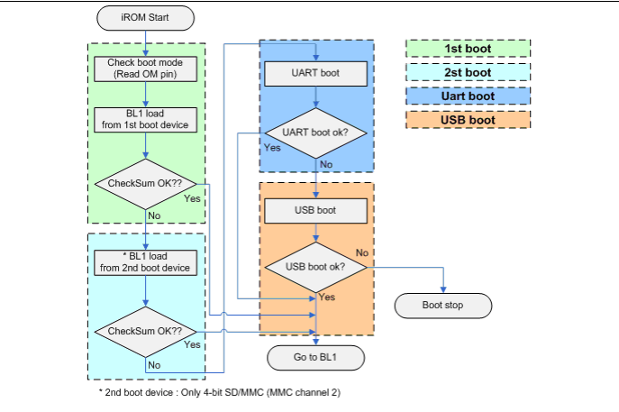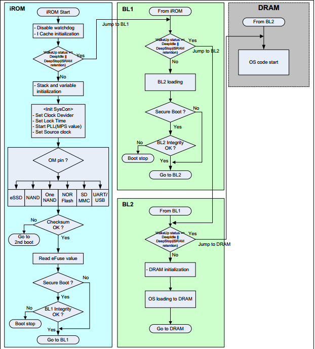第三步:从IRAM运行BL2,BL2初始化DRAM,然后将OS读取到DRAM中,然后启动OS,启动过程结束。