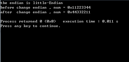 #include <stdio.h>#include <stdlib.h>//判断大小端字节序void judgeEndian(){int num = 0x01020304;char* pchar = (char*)#if(*pchar==0x01){printf("the endian is Big-Endian\n");}else if(*pchar==0x04){printf("the endian is little-Endian\n");}else{printf("other-Endian\n");}}//改变数字num的字节序//如果是大端转化为小端//如果是小端转化为大端int changeEndian(int num){char* p = (char*)#int d = (*p++)&0xff;int c = (*p++)&0xff;int b = (*p++)&0xff;int a = *p;return (d<<24)|(c<<16)|(b<<8)|a;}int main(){judgeEndian();int num = 0x11223344;printf("before change endian , num = 0x%x\n",num);printf("after change endian , num = 0x%x\n",changeEndian(num));return 0;}
