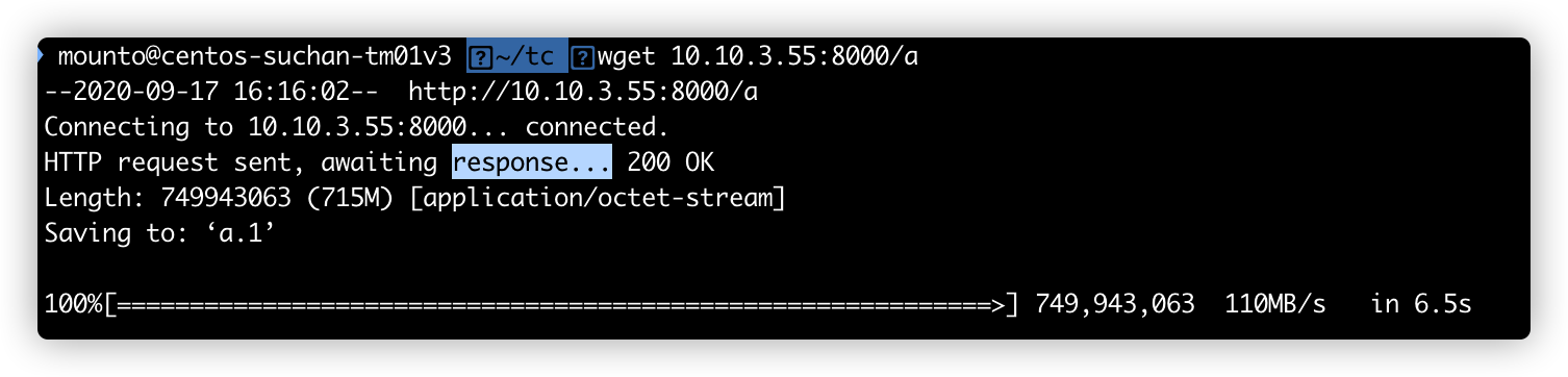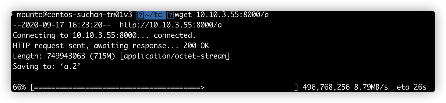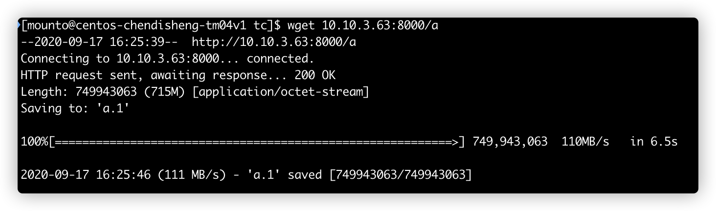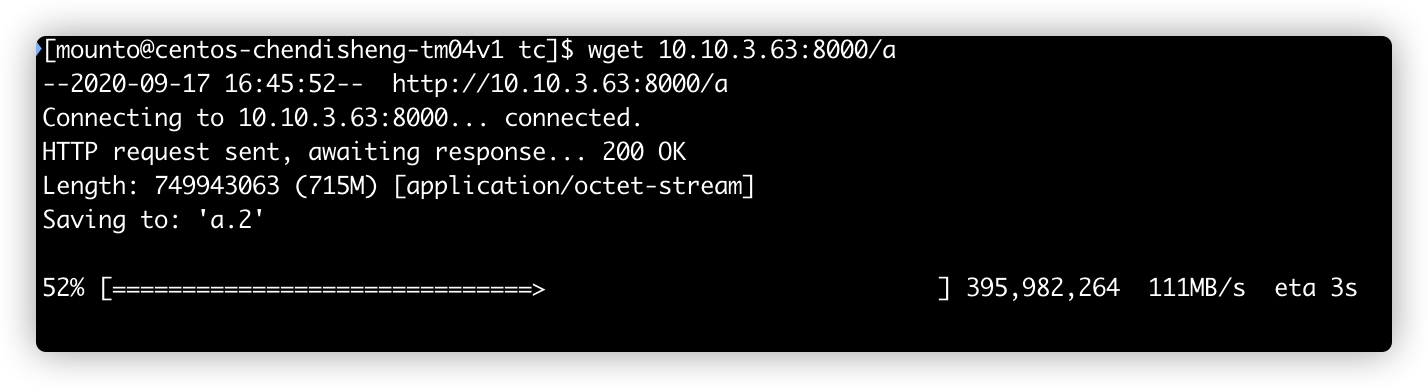 步骤1: 首先找两台机器,分别起两个http server 模拟服务端和客户端,这两台机器上都有一个大文件用来测试,可以使用如下 python 命令: