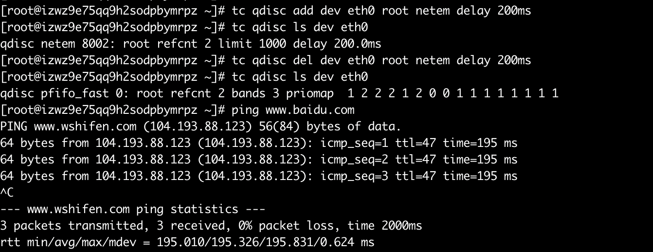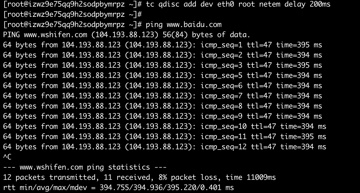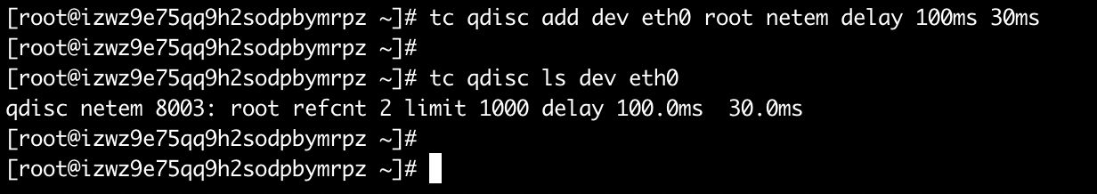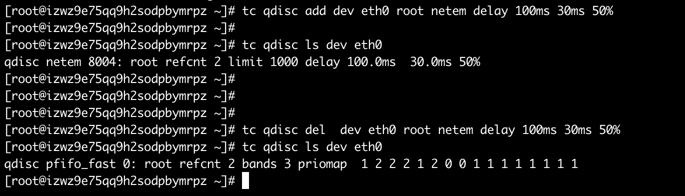 当前网络抖动较大,所以执行命令后,结果不是特别准确,不过可以看出,延时确实是有效果的,同样的,删除该命令: