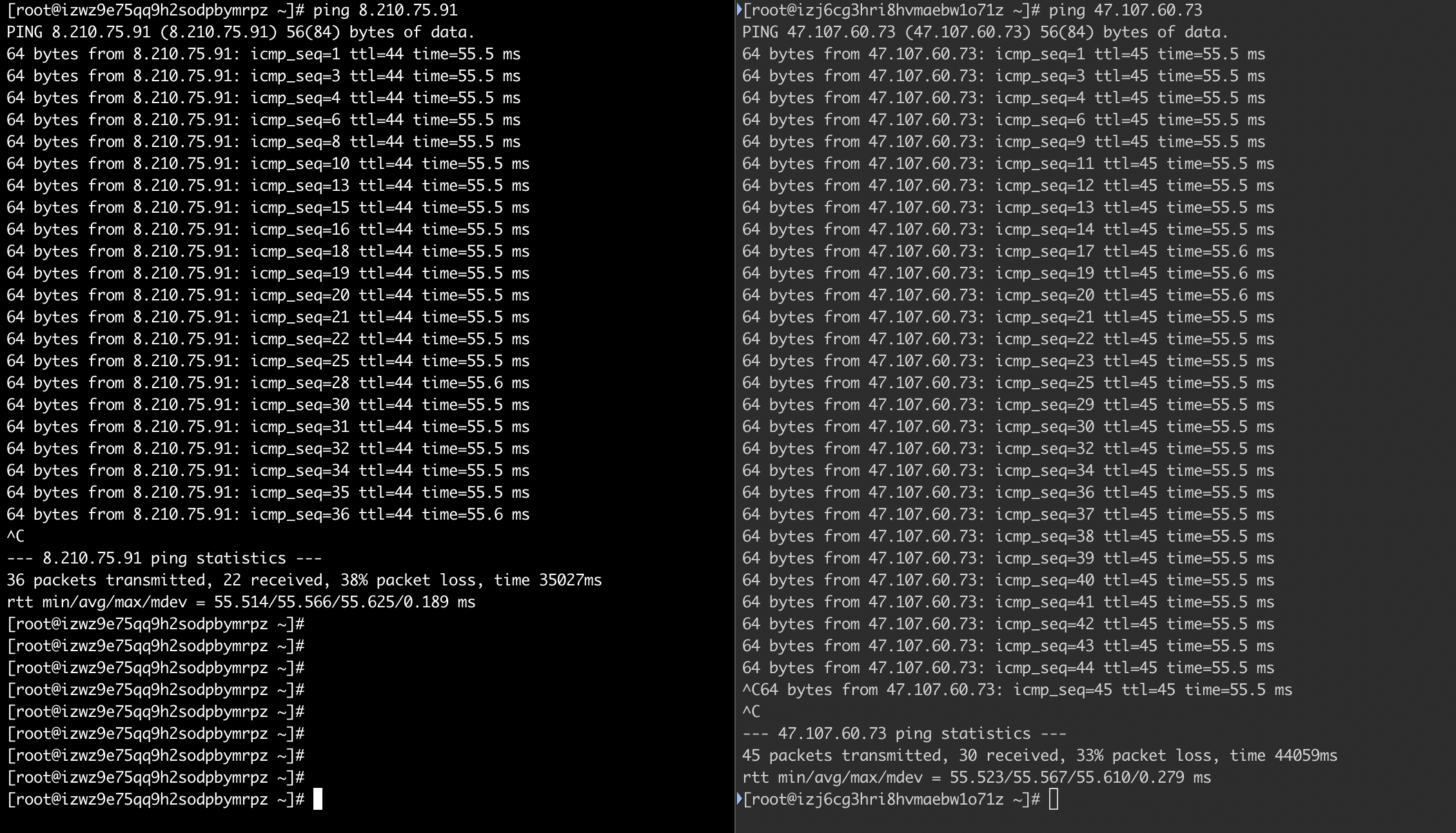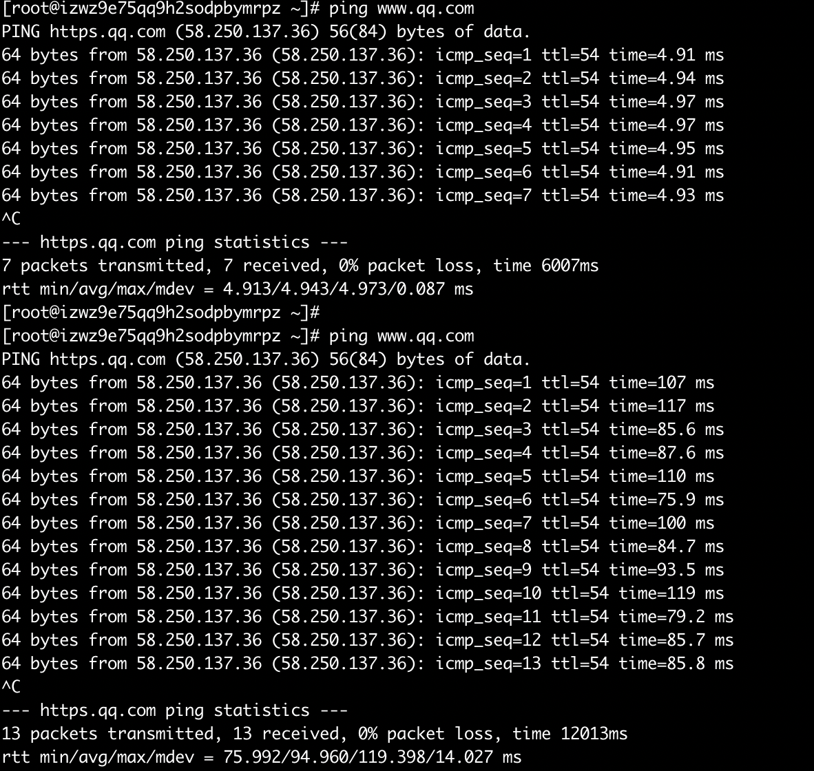 需要注意的是 tc 工具对网卡延时,丢包的操作是双向的,在执行 tc 命令之间,两台机器 互相 ping 延时如下: